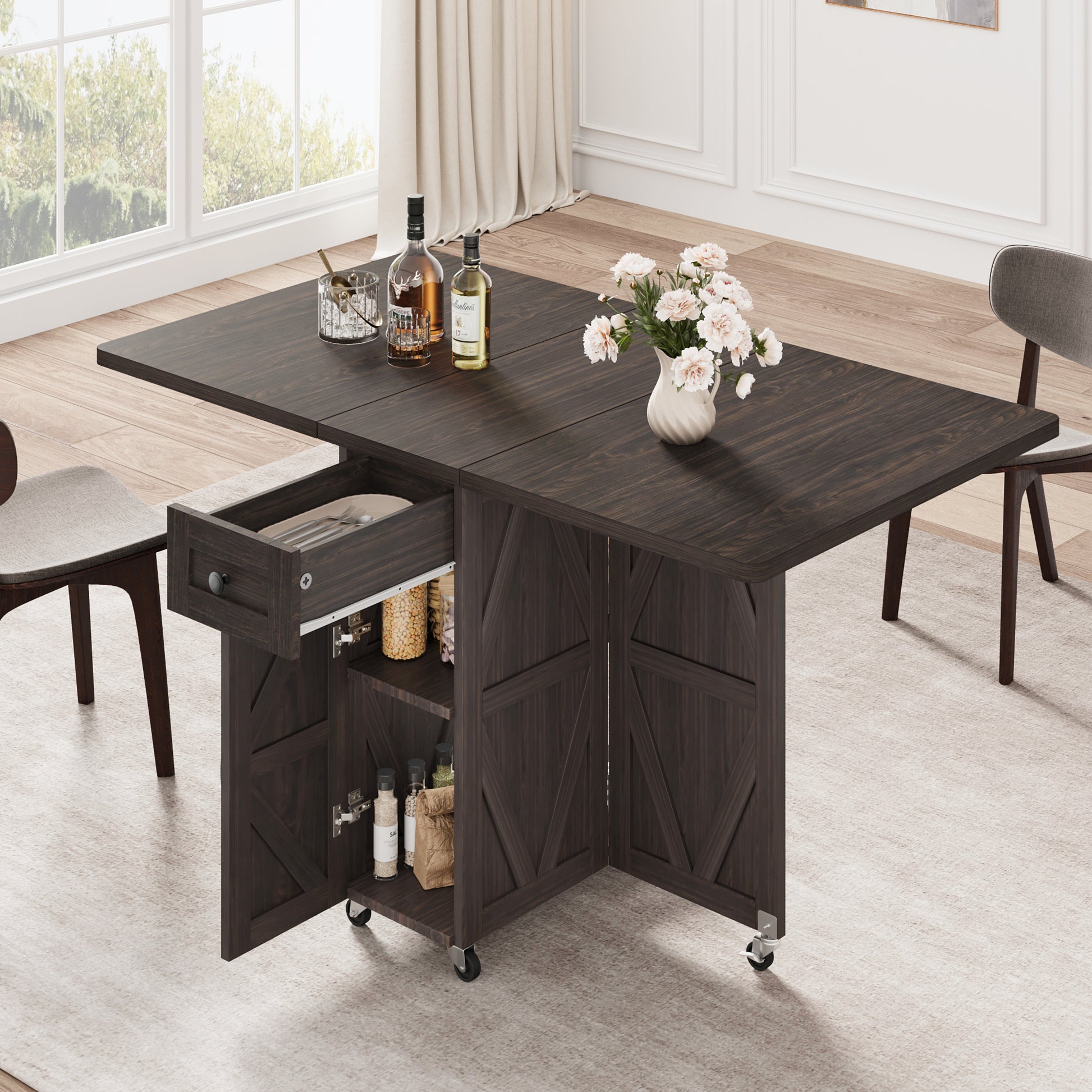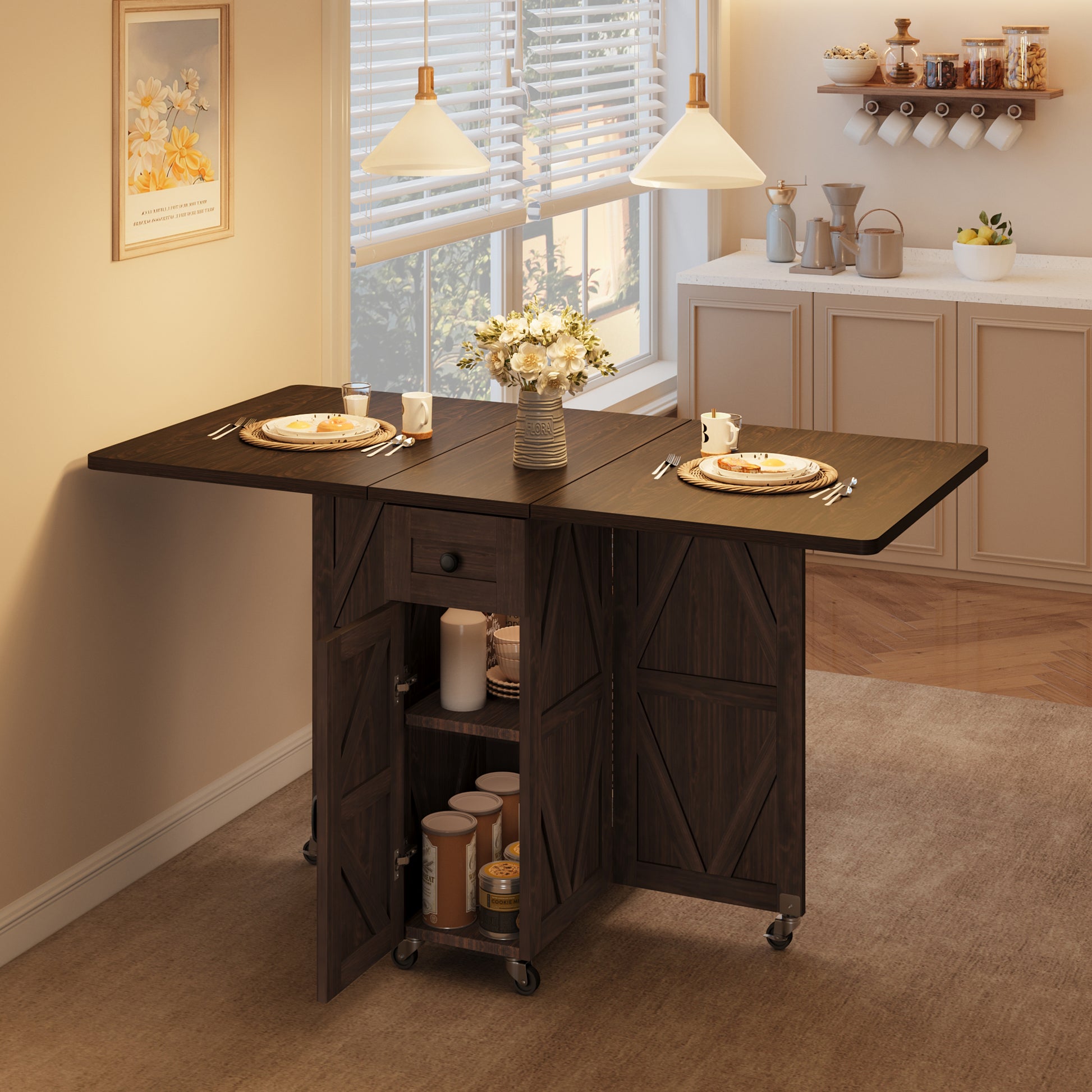 - Keep the table leaf completely extending, it turns into a spacious dining table to accommodate up to four guests