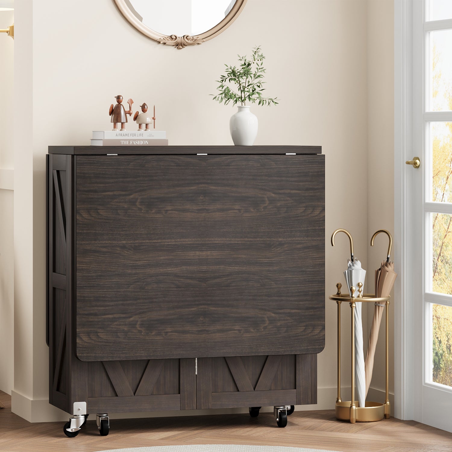 - Folding a leaf of the table, to be a writing computer desk. Fold down 2 leaves and turn it into a nice console table by your apartment's entrance or a sofa table behind the couch
