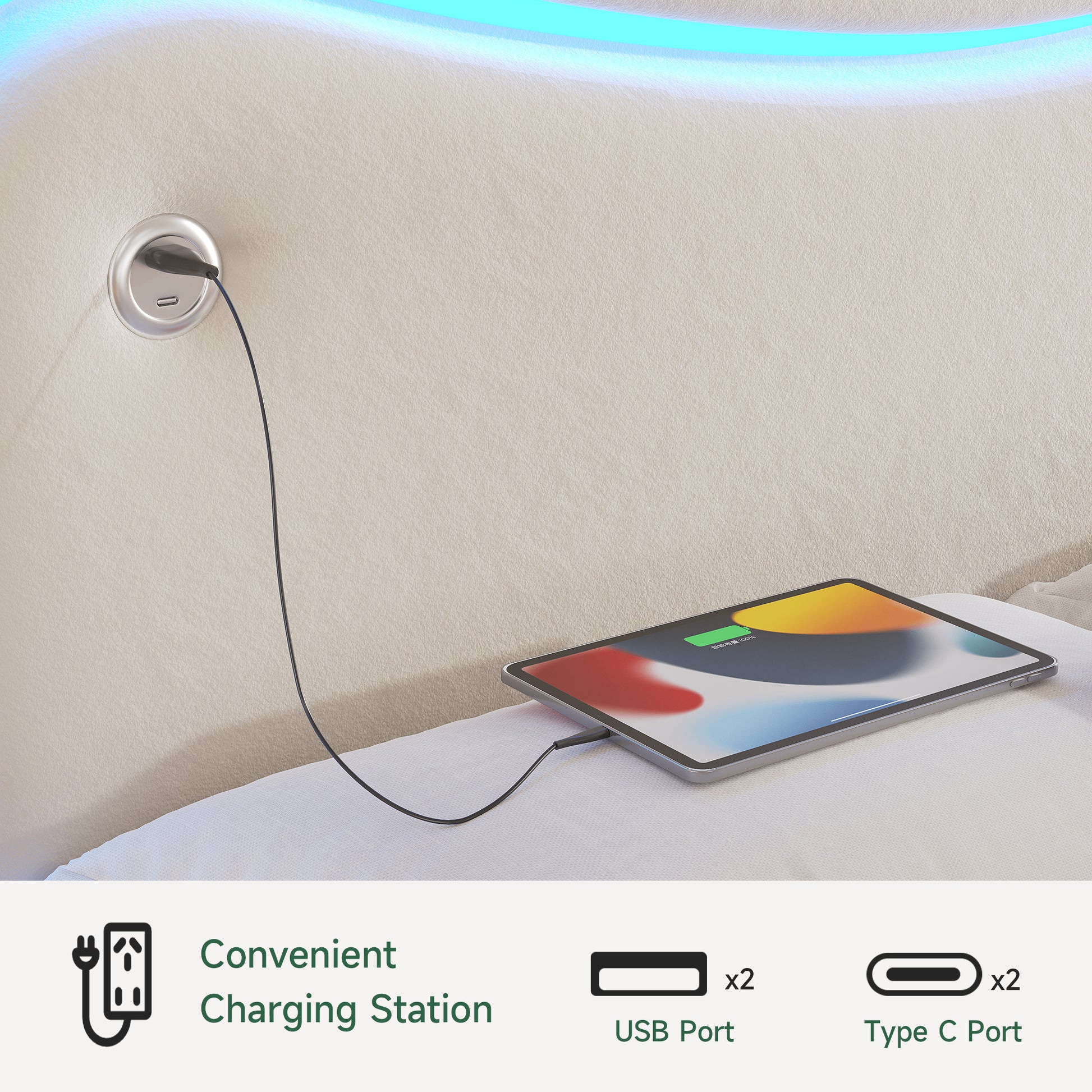 - Floating Bed Frame with Charging Station: Anyact full bed frame headboard with a built-in charging station on both sides of the bed, while built-in USB port (1x) and type-c port (1x) keep devices powered for your mobile phone, tablet or laptop while lying comfortably in bed. Say goodbye to distant sockets and tangled wires, giving you a clean and convenient environment.