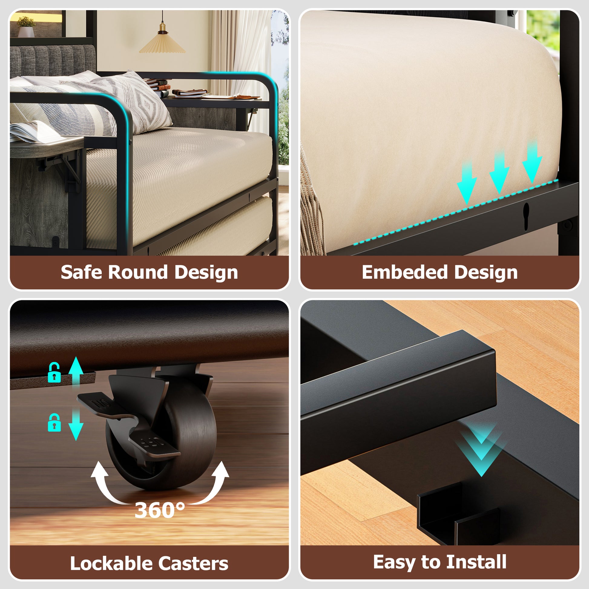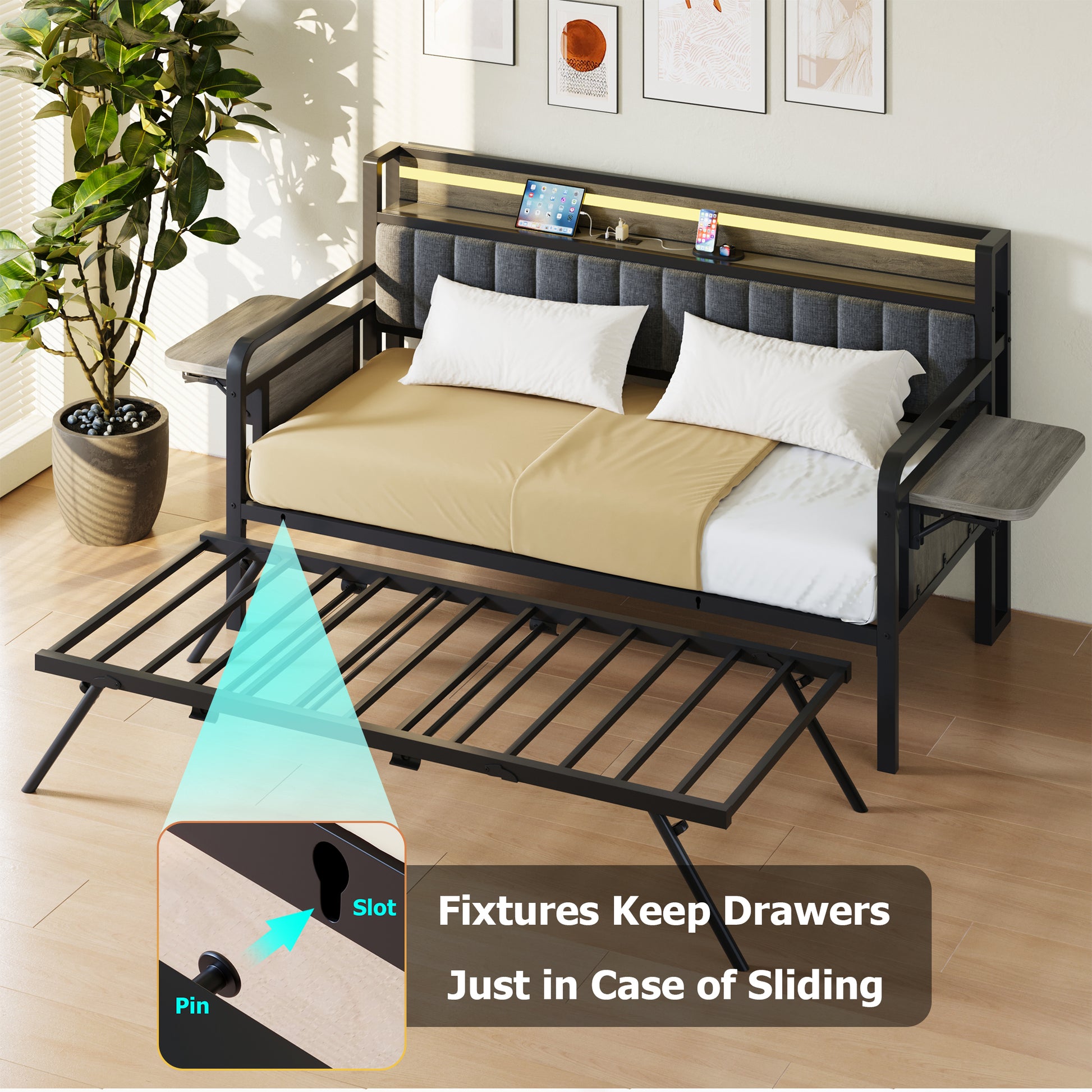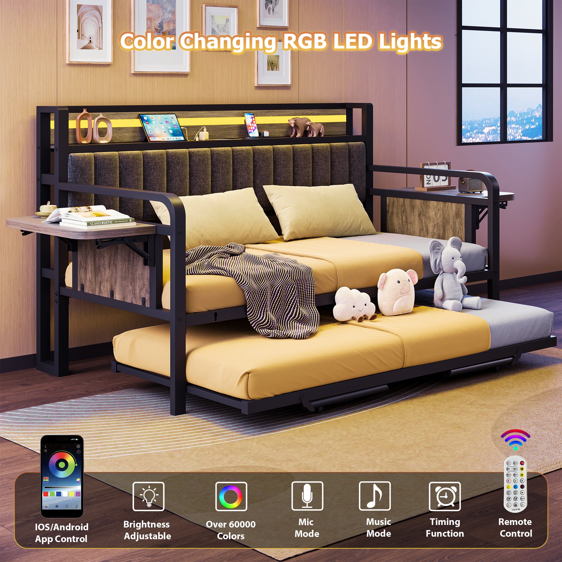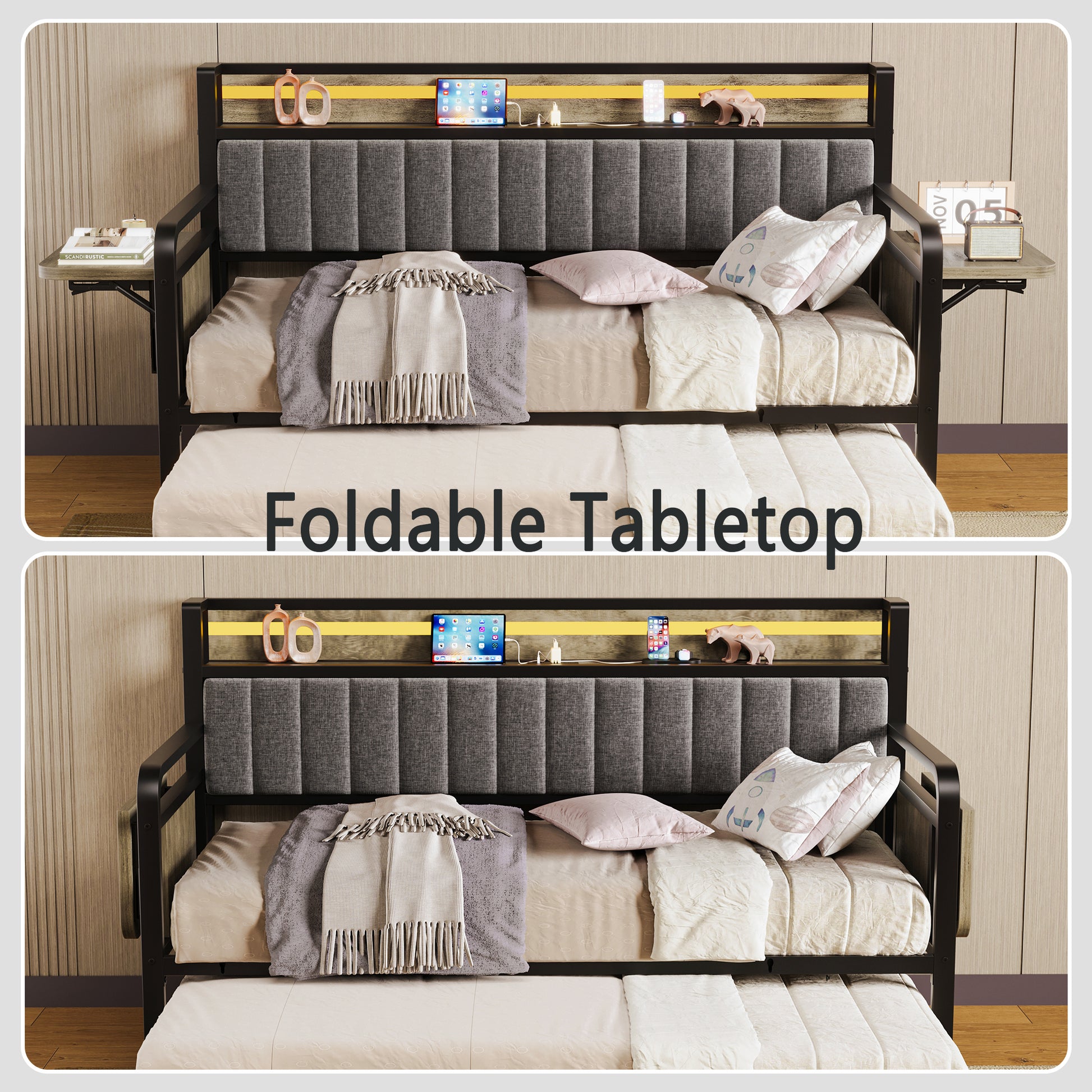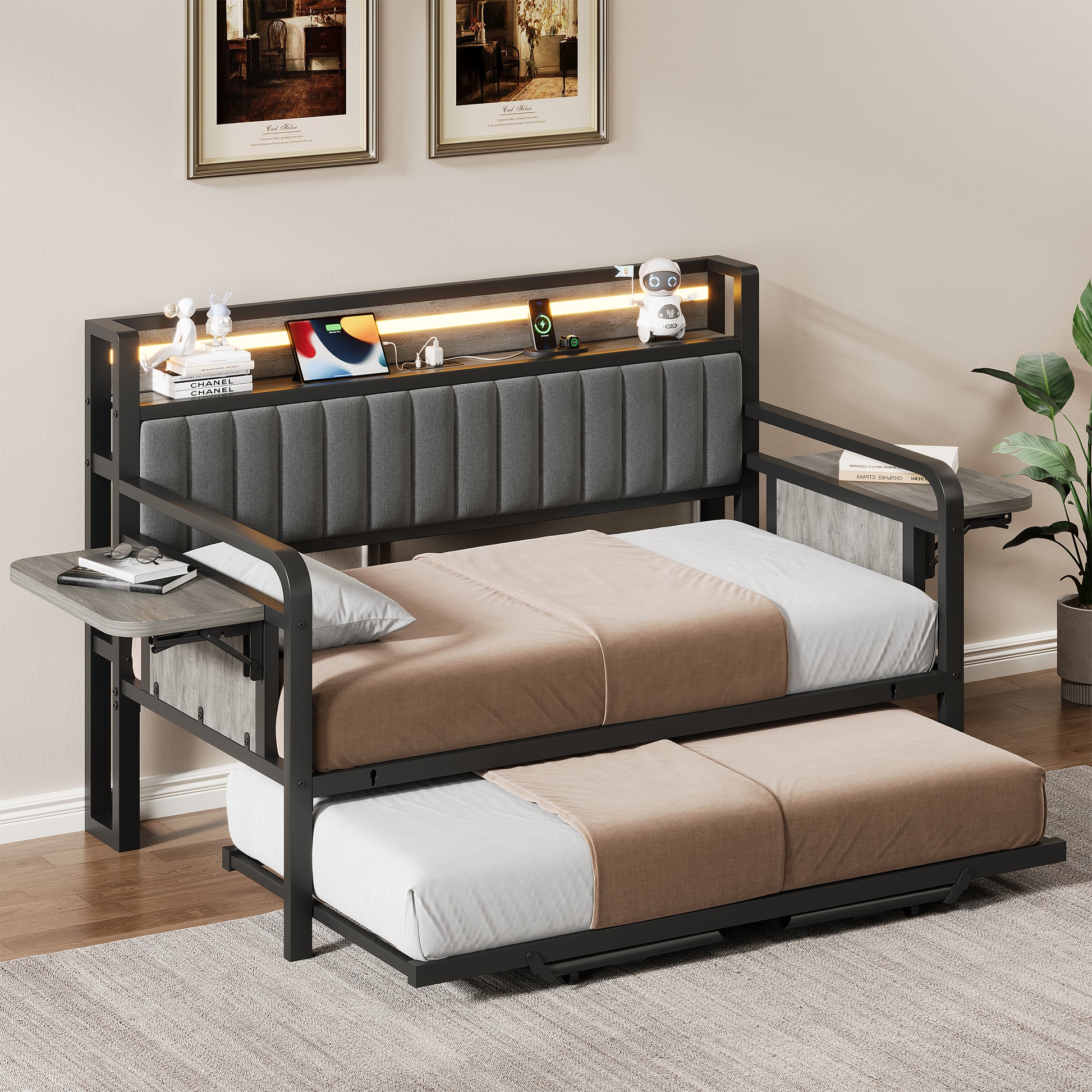 Anyact Twin Daybed with Side Table, Heavy Duty Metal Bed Frame with Pop Up Trundle, LED Lights Charging Station Upholstered Storage Headboard, Twin Sofa Bed for Living Room Bedroom Guest Room, Gray