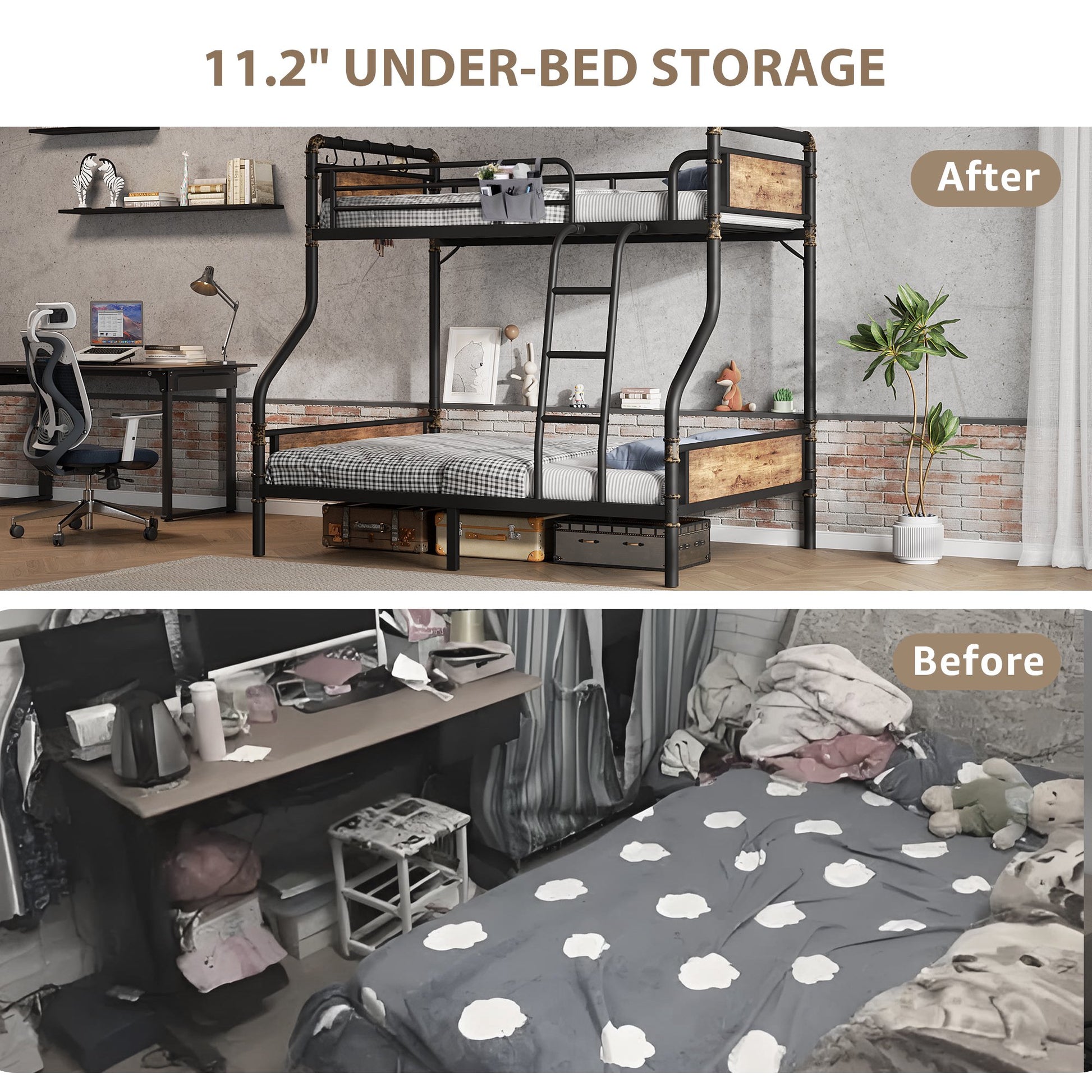 - Multi-functional Storage Solutions: This twin over full bunk bed include a handy bedside storage bag for essentials like phones, glasses, chargers and remotes, as well as four hooks for hanging bags, scarves, hats and keys, making the top bunk even more practical. The 11.2-inch under-bed space provides ample room for suitcases or other large items, significantly expanding bedroom storage options and keeping the space organized.