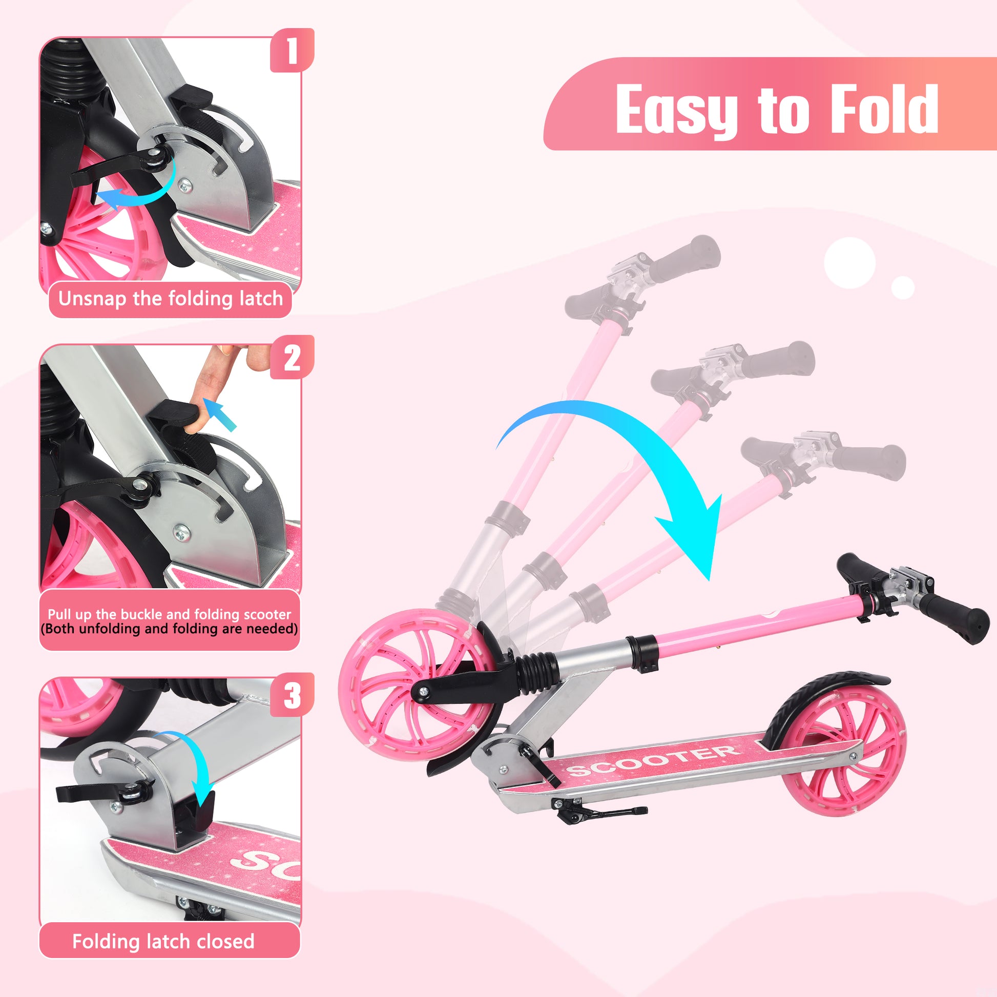 - Quick Push-Button Folding: Just touch the folding button to fold your scooter into a small compact size, with the carrying strap, you can take the scooter anywhere you want.