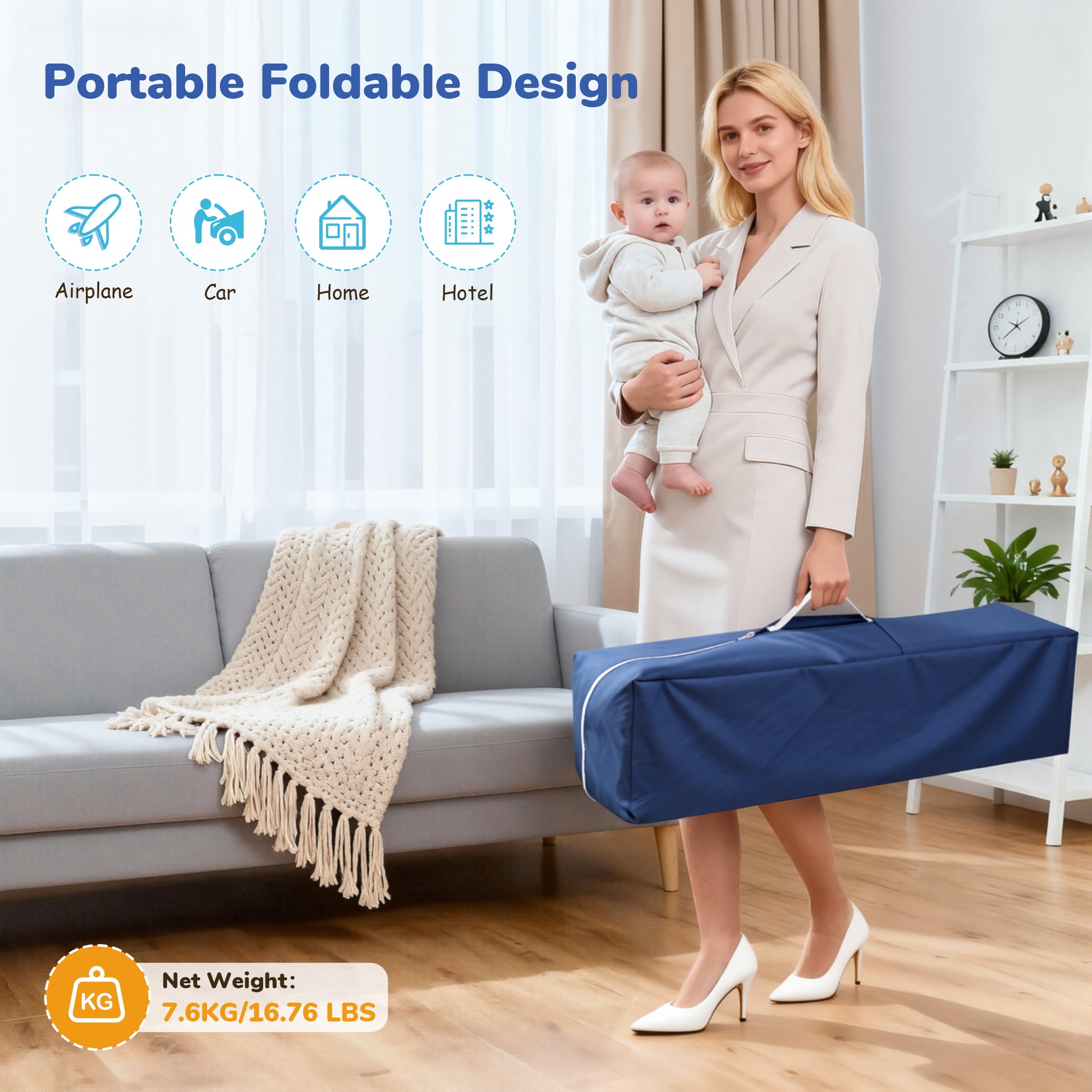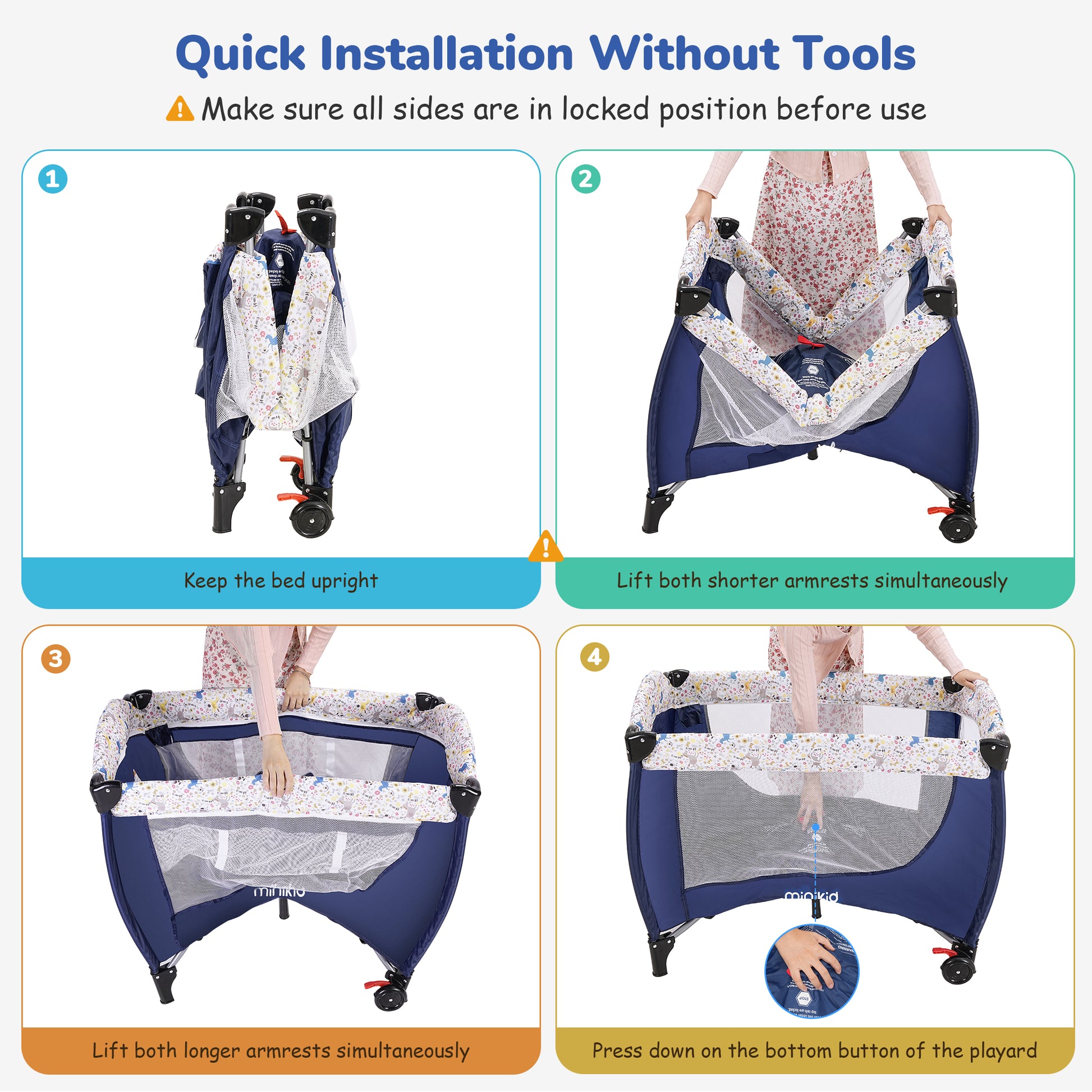 - 🔷【Easy and Quick Assembly and Transport】Without any tools, you can quickly fold this baby bassinet into a compact size to save space. The free carrying bag allows you to store the baby play yard and all accessories to avoid losing them. The 2 wheels are equipped with a braking system, which can perform well whether it is mobile or fixed.