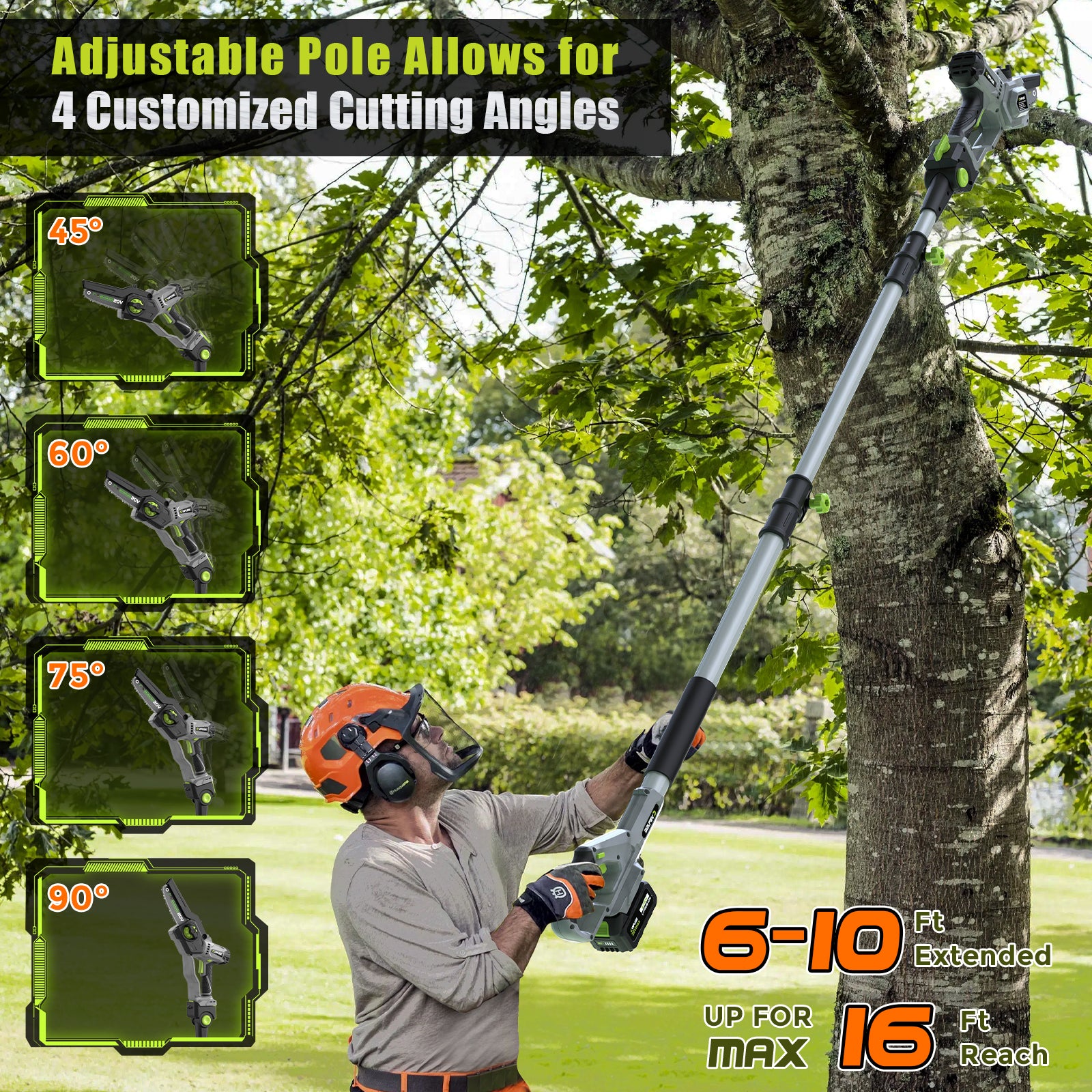 Versatile Design: This 2-in-1 cordless pole saw is designed for trimming overhanging high branches, ground branches, and thin logs, featuring a durable, lightweight aluminum telescopic pole that extends to 16 feet (including a 6 ft person, pole, and saw).