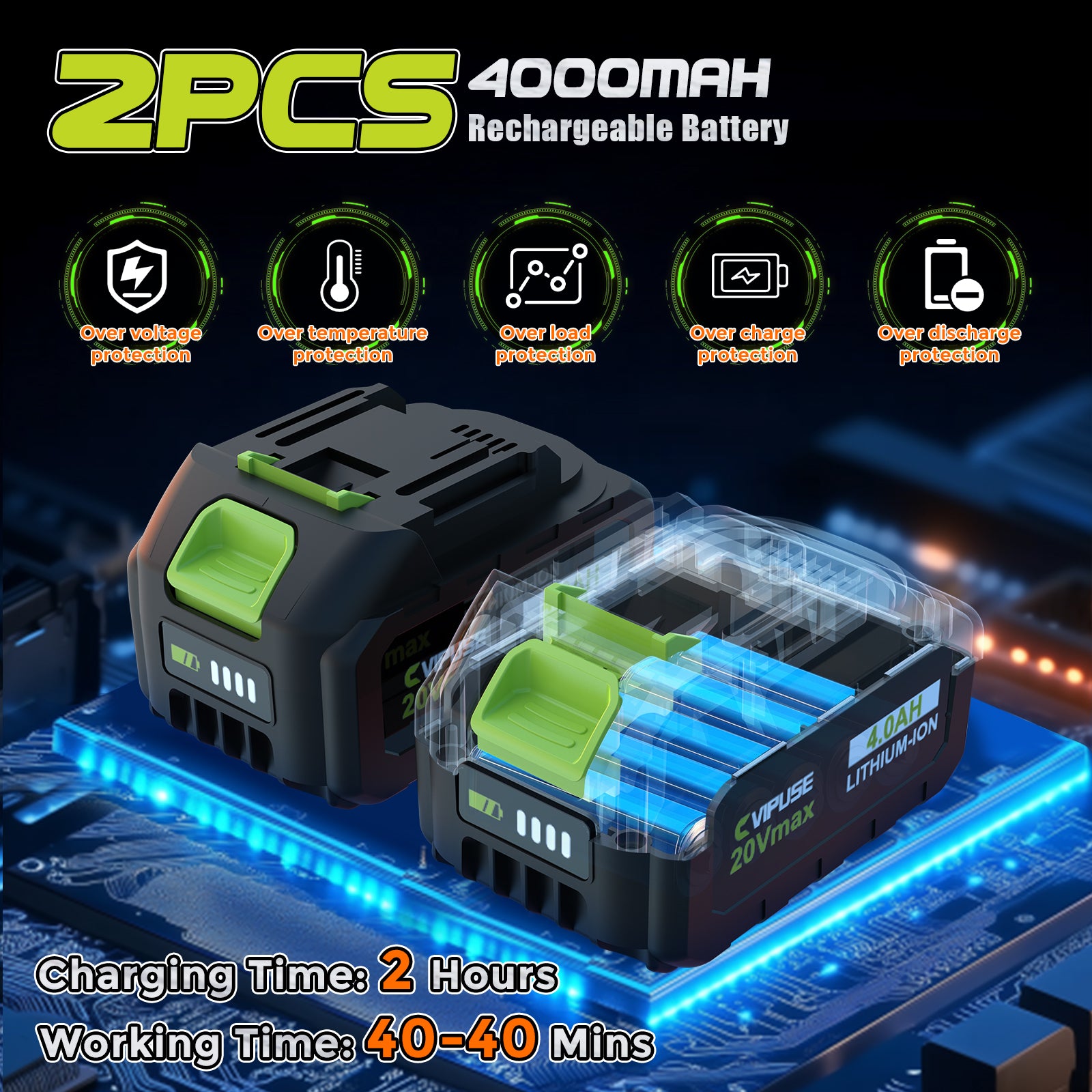 Extended Battery Life: Includes two 20V 4.0Ah rechargeable batteries and a 2.0Ah fast charger, providing approximately 1 hour of continuous working time.