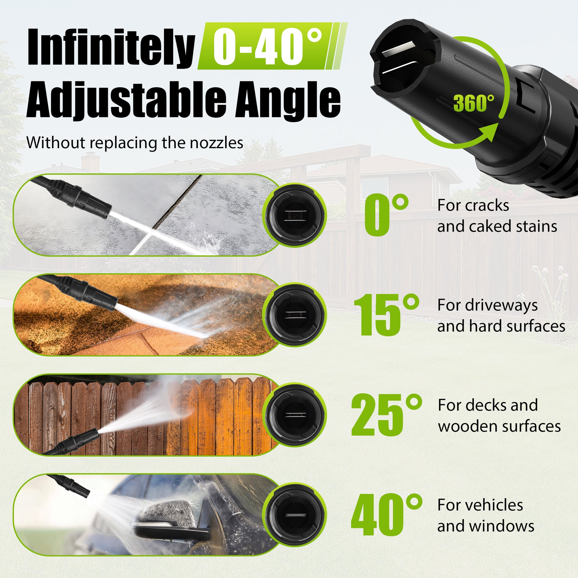 - With Rotatable Nozzle (0-120° nozzle angle), you can easily adjust the spray pattern to suit your cleaning needs. From concentrated power to wider coverage, these nozzles provide versatility for a wide range of cleaning tasks.