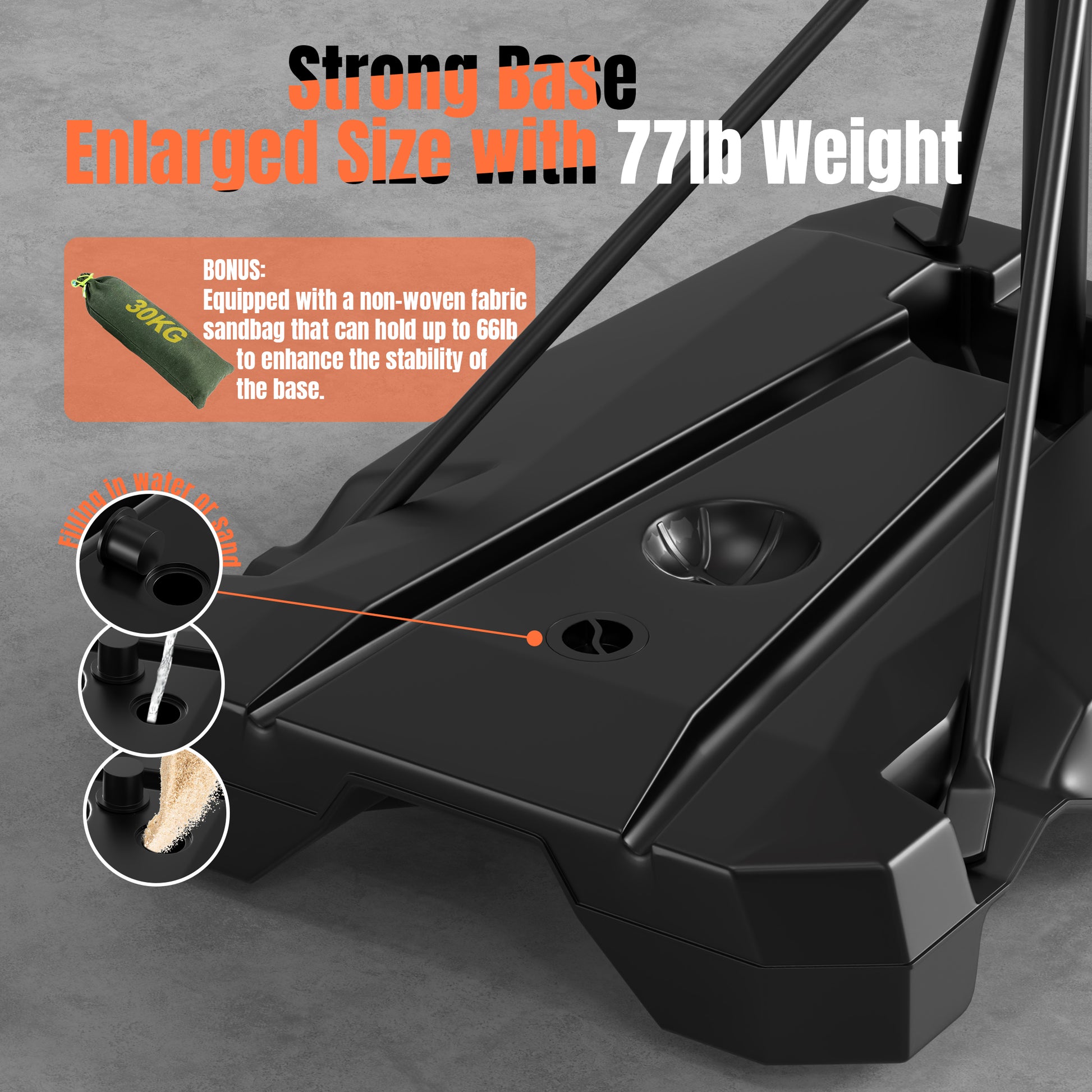 Enlarged Base & PC Backboard for Stability&Durability-In order to provide enough support to match the raised maximum height, we enlarged the base which could be filled with water or sand up to 77lbs. Besides, we provide a gift sandbag which could be filled with up to 67lbs sand.So total weight of the base is about 144lbs.